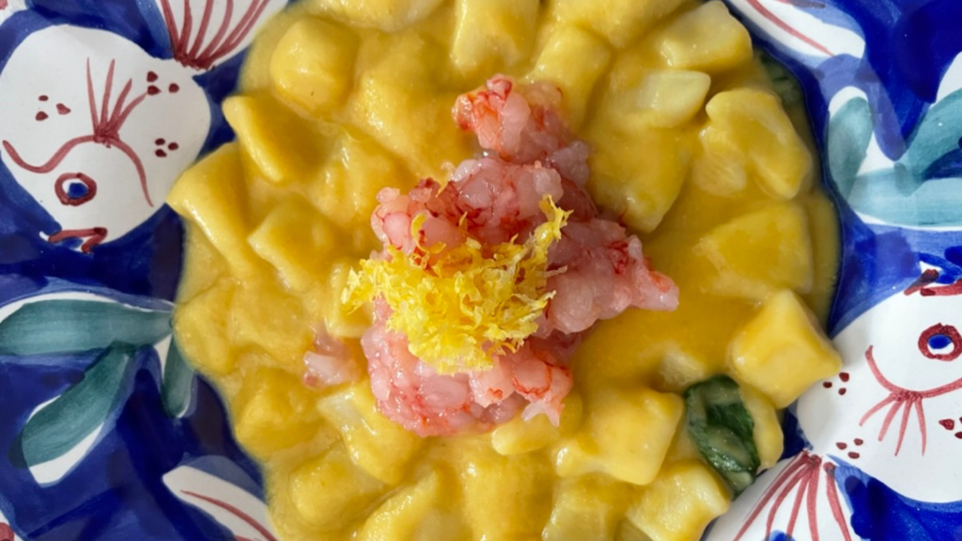 Scoliamo gli gnocchi nella padella insieme alla crema di pomodoro aggiungendo anche quattro foglie di basilico. Mentre li facciamo amalgamare con il sugo, creiamo la nostra tartare di gambero rosso: tagliamo delicatamente con il coltello, aggiungiamo un pizzico di sale e un filo di olio extravergine di oliva.