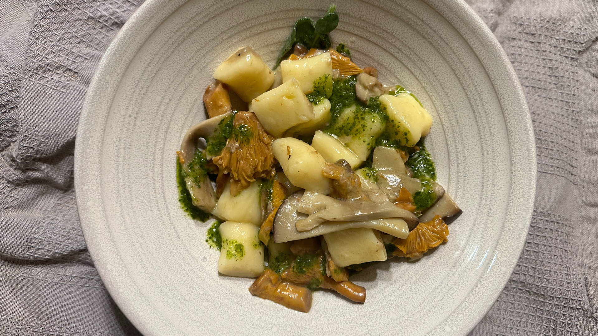 Immergiamo gli gnocchi, ci metteranno circa cinque minuti per salire a galla, li scoliamo direttamente nella padella con i funghi: aggiungiamo un mestolo di acqua di cottura e saltiamoli per qualche minuto insieme agli gnocchi e a un paio di foglie di salvia per insaporirli ancora di più.