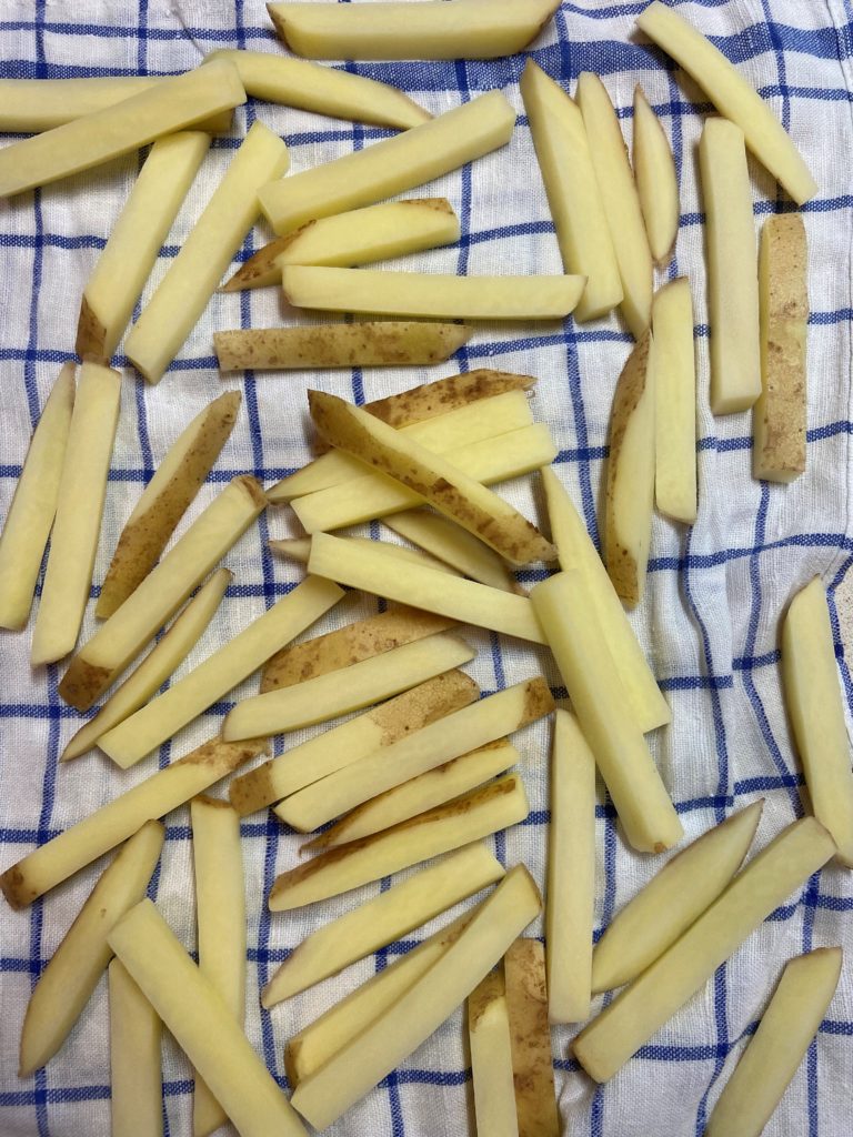 Il primo passo è ovviamente il taglio delle patate. Ho ormai da molti anni un taglia-patate professionale, esclusivamente in alluminio (che si può trovare su Amazon a partire da 35-40 euro) che ha migliorato drammaticamente la resa delle mie patatine fritte perché semplicemente le taglia tutte delle stesse dimensioni, oltre ad azzerare quasi i tempi di taglio delle patate. Io personalmente lascio sempre la buccia, gli da quel tocco di rustico e rimane più croccante.