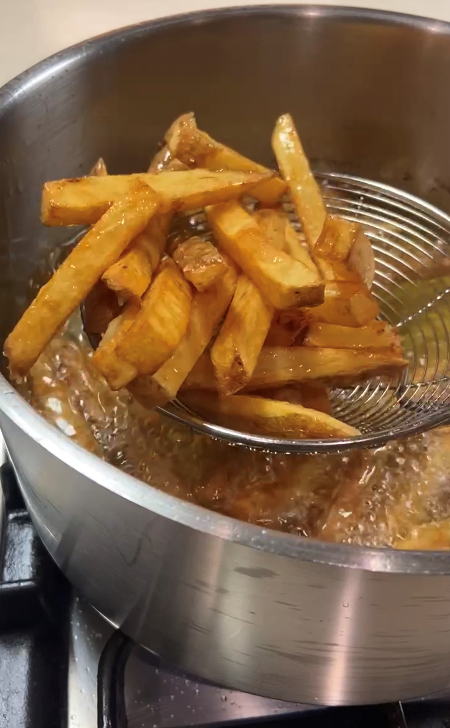 Adesso per l’ultima fase l’olio deve raggiungere una temperatura di 185 gradi, a questo punto le patatine saranno già cotte, l’ultima cottura, di circa 2-3 minuti, serve solo per riscaldarle e per darle quel colore dorato che tutti amiamo. Mi raccomando la temperatura!