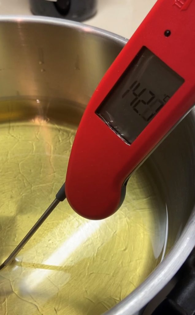 Possiamo cominciare a scaldare l’olio, rigorosamente di semi. Qui è importantissimo avere a disposizione il termometro, tutti gli altri rimedi della nonna non funzionano in questo caso mi dispiace. Il primo giro di frittura deve avvenire con l’olio a una temperatura di circa 160 gradi per altri 6 minuti: maggiore è la quantità di patatine maggiore deve essere la dimensione della casseruola, io uso sempre la mia casseruola di ghisa da circa 30cm di diametro quando preparo le patatine per quattro persone (circa 800gr di patate). La temperatura non è altissima perché di fatto stiamo ancora cuocendo le patatine ed è importante sempre tenerla monitorata: nel caso doveste preparare patatine per più di 4 persone suggerisco di cuocerle separatamente per evitare di far raffreddare troppo l’olio.