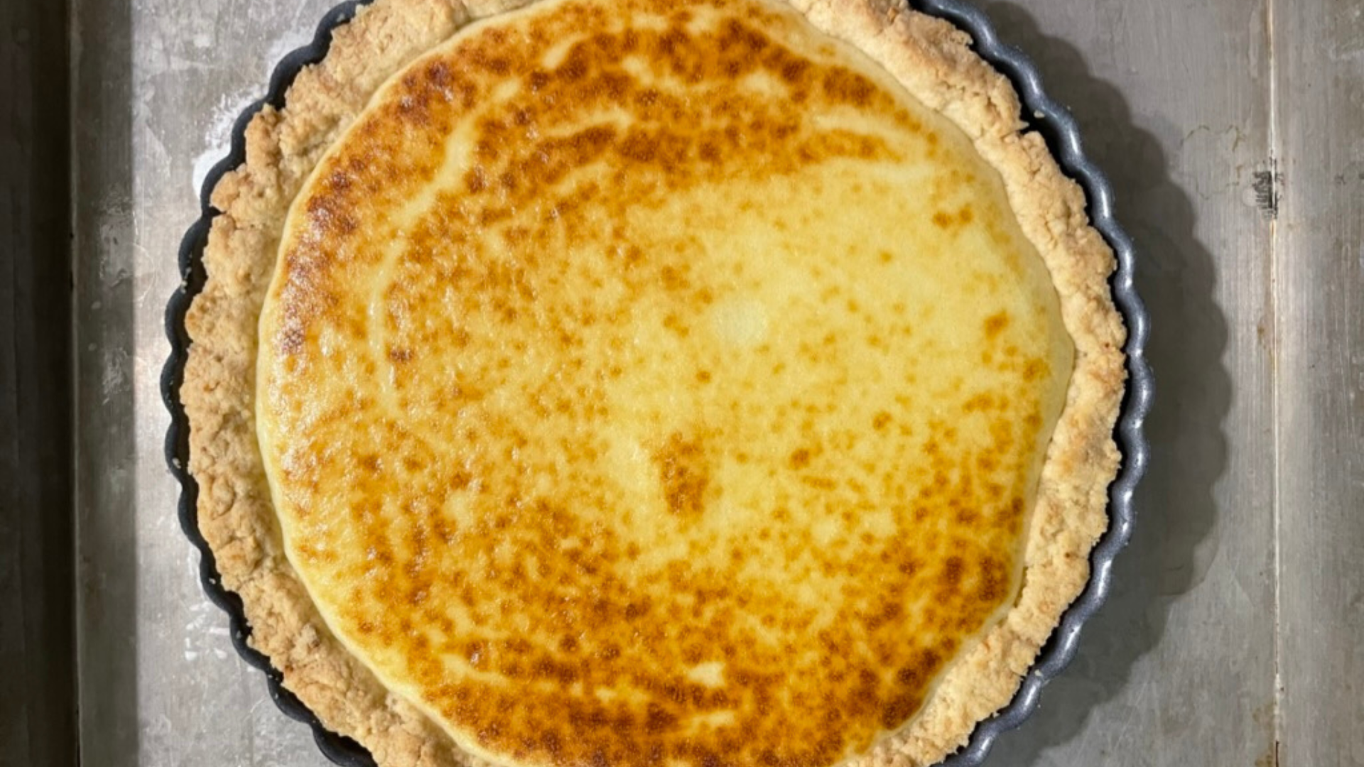 Accendiamo il forno con modalità grill a 200° e spostiamo la griglia nella parte alta del forno. Adesso versiamo la crema sulla frolla che abbiamo cotto in precedenza, dovrà arrivare fino all’orlo della crostata, e posizioniamo lo stampo dentro una teglia nella parte alta del forno: in realtà non dovrà cuocere la crema ma semplicemente ‘caramellizzarla’ per 3-4 minuti fino a farle prendere ‘colore’.