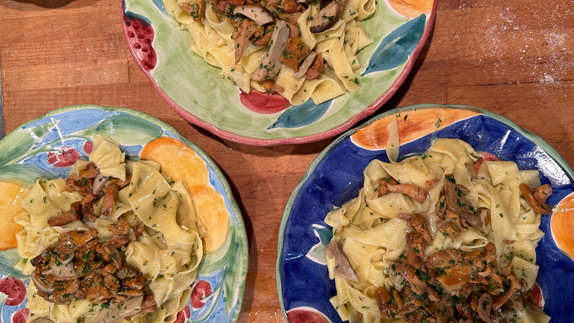 Scoliamo le pappardelle nella padella con i funghi e mescoliamo delicatamente per non rompere la pasta, aggiungiamo un mestolo di acqua di cottura e la noce di burro per un po’ di morbidezza.