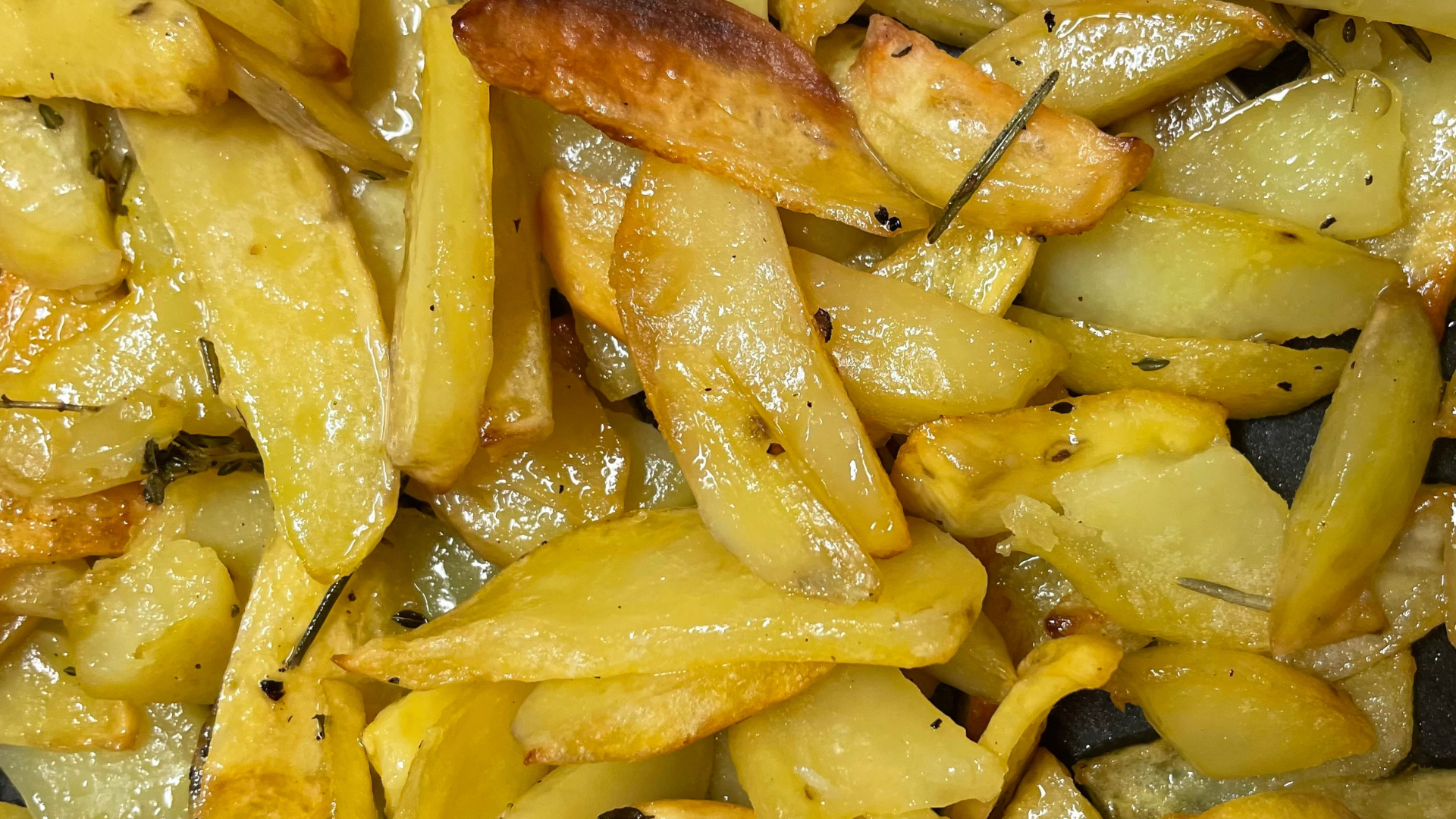 Per avere delle patate croccanti è importante, dopo averle tagliate, lasciarle riposare circa 15 minuti in acqua fredda, con l’obiettivo di togliere parte del loro amido. Dopo possiamo scolarle – vedremo l’amido sciolto misto all’acqua – e le lasciamo asciugare per circa venti minuti.