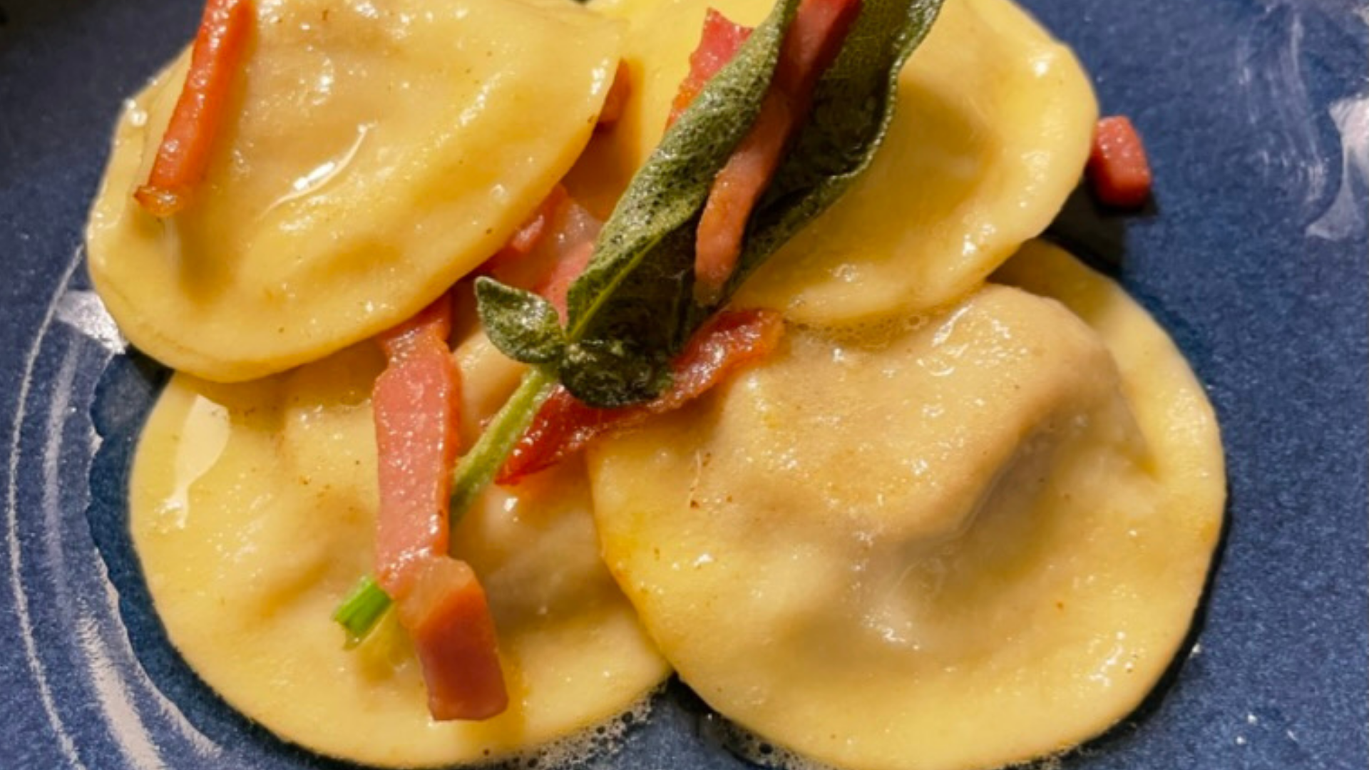 Non ci resta che impiattare i ravioli con il burro e lo speck e diamo una ultima spolverata con le nocciole tostate.