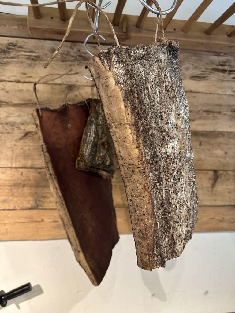 Non può mancare il classico pezzo di Speck, prodotto IGP altoatesino, solitamente accompagnato da un coltello, per tagliarlo nel modo in cui preferiamo, principalmente a listarelle, insieme ad altri salumi tipici, a formaggi vaccini, a cetriolini sott’aceto e un bel cucchiaio di cren, una crema piccante di rafano.