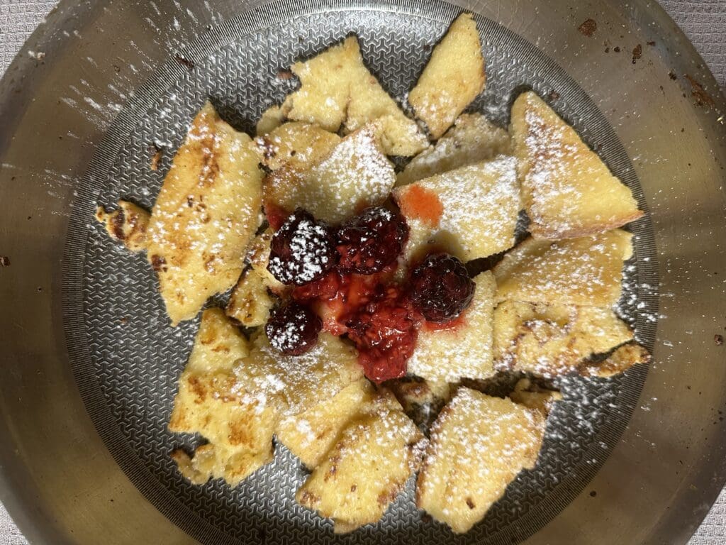 Poi a un certo momento arriva il dolce, e tutti si fermano: c’è sempre l’imbarazzo della scelta, ovviamente le mele sono presenti in molte preparazioni, dalle frittelle allo strudel. Ma il re assoluto, ovviamente per mia umile opinione, è il Kaiserschmarren, o la frittata dell’imperatore (il suono è decisamente più romantico in tedesco che in italiano): nato come molti piatti per errore, l’imperatore Francesco Giuseppe (si, quello della principessa Sissi) aveva chiesto in realtà una crêpe, che durante il salto in padella si è rotta. Per rimediare all’errore lo chef terrorizzato ha deciso di romperla grossolanamente e aggiungere per decorazione uva sultanina e zucchero a velo, accompagnata da una confettura di ribes. Se dopo più di centocinquant’anni la tradizione resiste ancora di sicuro l’imperatore avrà apprezzato.