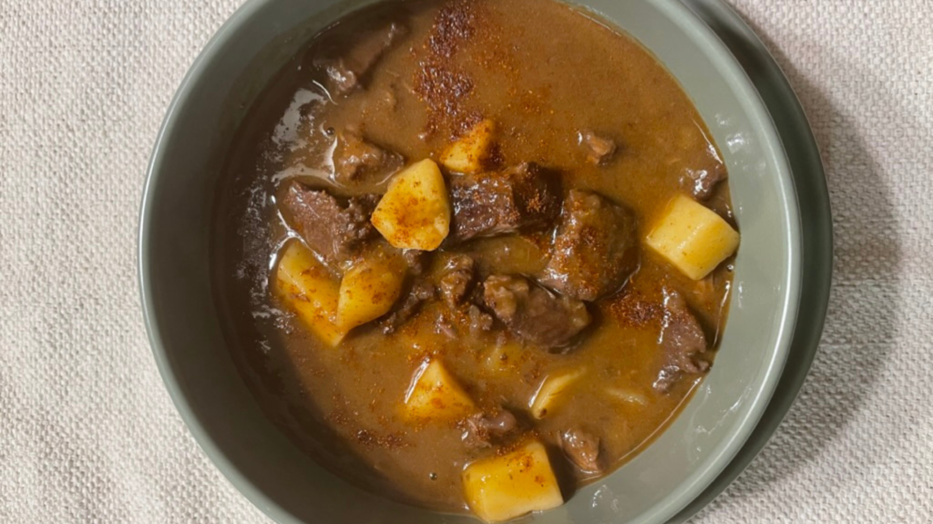 Ora possiamo aggiungere il concentrato di pomodoro, le erbe aromatiche (timo e alloro), i due tipi di paprika e metà del brodo di carne, mescoliamo bene, chiudiamo il coperchio, abbassiamo la fiamma e andiamo a riposare 15/20 minuti sul divano. Non adagiamoci troppo, bisogna sempre stare all’erta vicino alla cucina nel caso qualcosa vada storto.